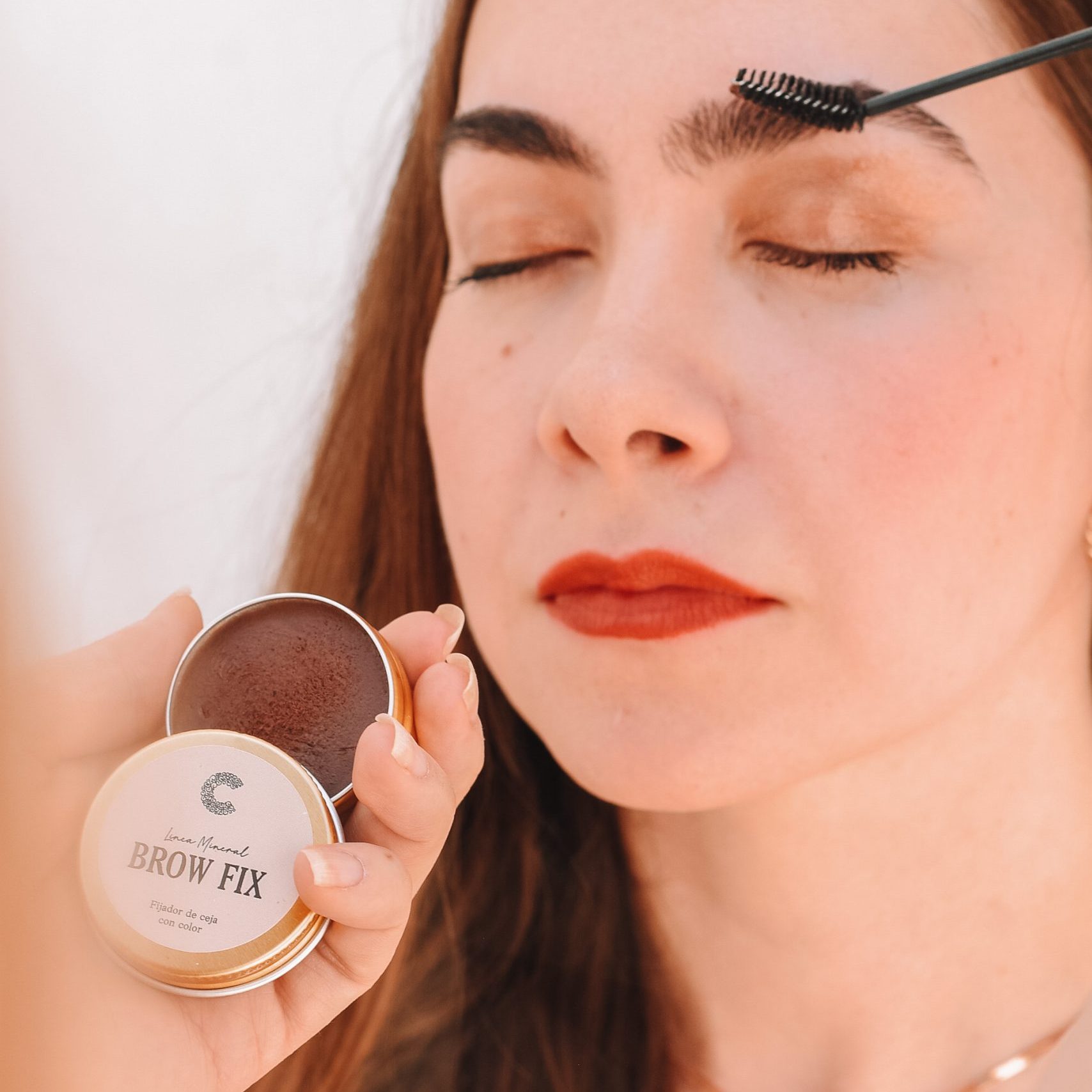 Agregar un poco de agua al cepillo incluido y frotarlo contra el producto en movimientos circulares hasta tomar suficiente producto en el cepillo y peinar la ceja a tu gusto. En caso de notar exceso de producto alrededor de ceja retirar con un hisopo o con los dedos.