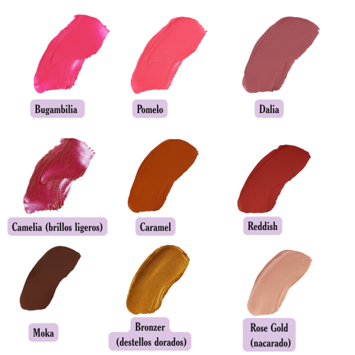 Aceite de ricino, aceite de oliva hidrogenado, aceite de sandía, manteca de mango, manteca de cacao, almidón de cebada, silica, cera de coco, cera de girasol y micas. Ingrediente extra en tono Bronzer: cacao en polvo Ingredientes extra en tono Caramel: cúrcuma y cacao en polvo